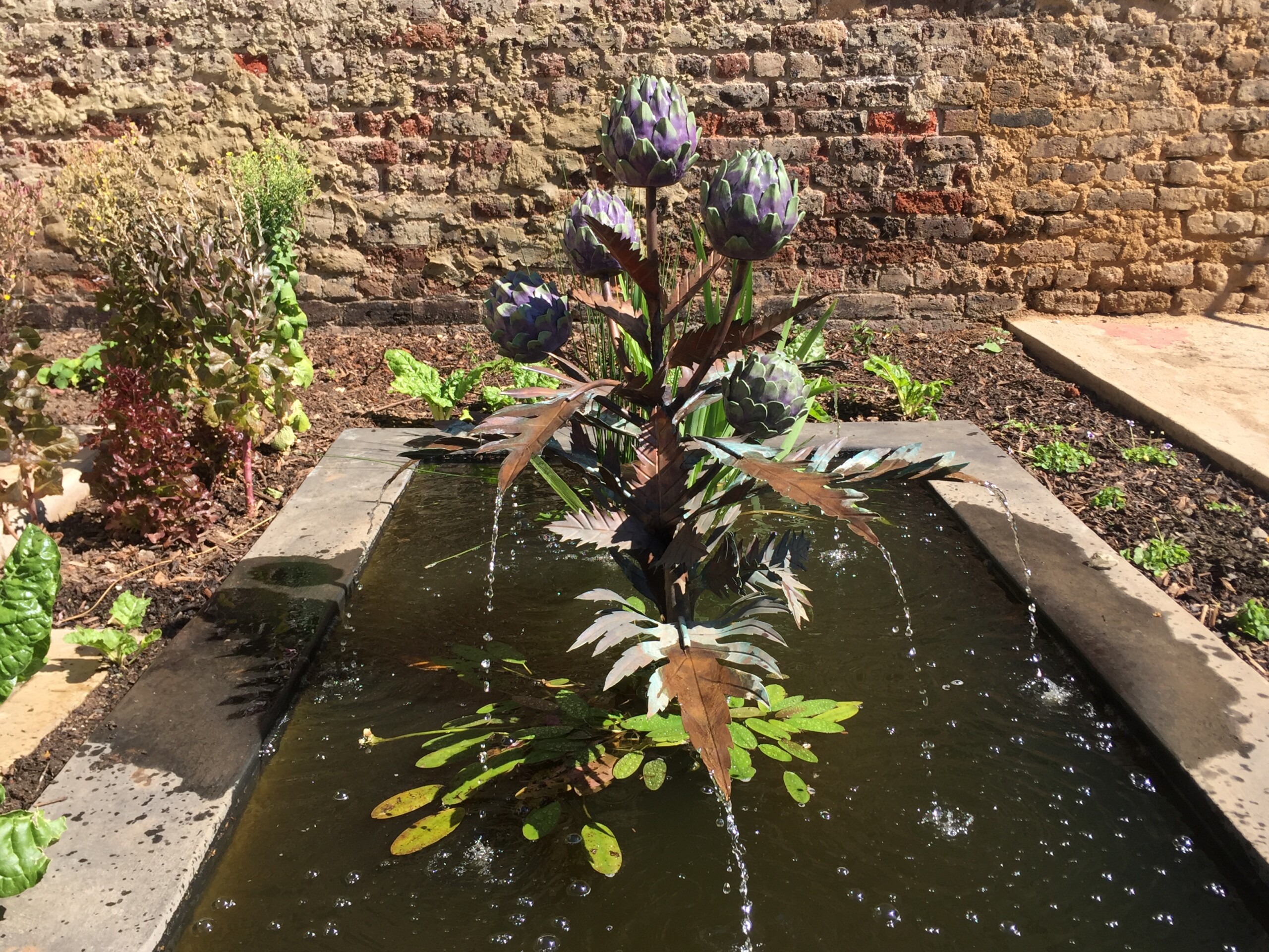 A layered artichoke water sculpture with broad serrated leaves and rich globe blooms. Gentle water movement adds texture and calm.