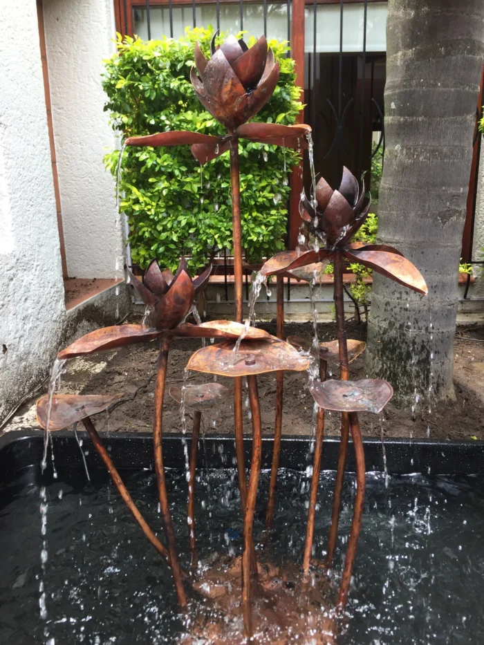 A medium-height lotus water sculpture with three flowers and four leaves. Elegant proportions make it ideal for a variety of garden settings.